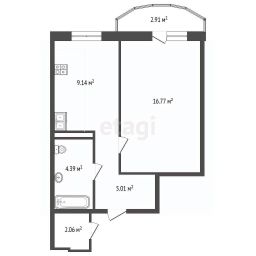 Кухня 9, 15 кв.м. Комната 16,77 кв.м. с выходом на балкон (застеклен пластиковым стеклопакетом). .