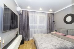 В спальне - кровать 160х200, прикроватные тумбы, тумба ТВ, встроенный шкаф, сплит-система (кондиционер);