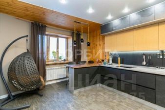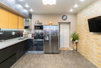 Кухня площадью более 20 м² станет мечтой любой хозяйки: множество шкафов из каменного и деревянного шпона, а также отдельная обеденная зона. Оконные проемы выполнены из натурального дерева, а пластиковые окна гармонично вписываются в общий интерьер.