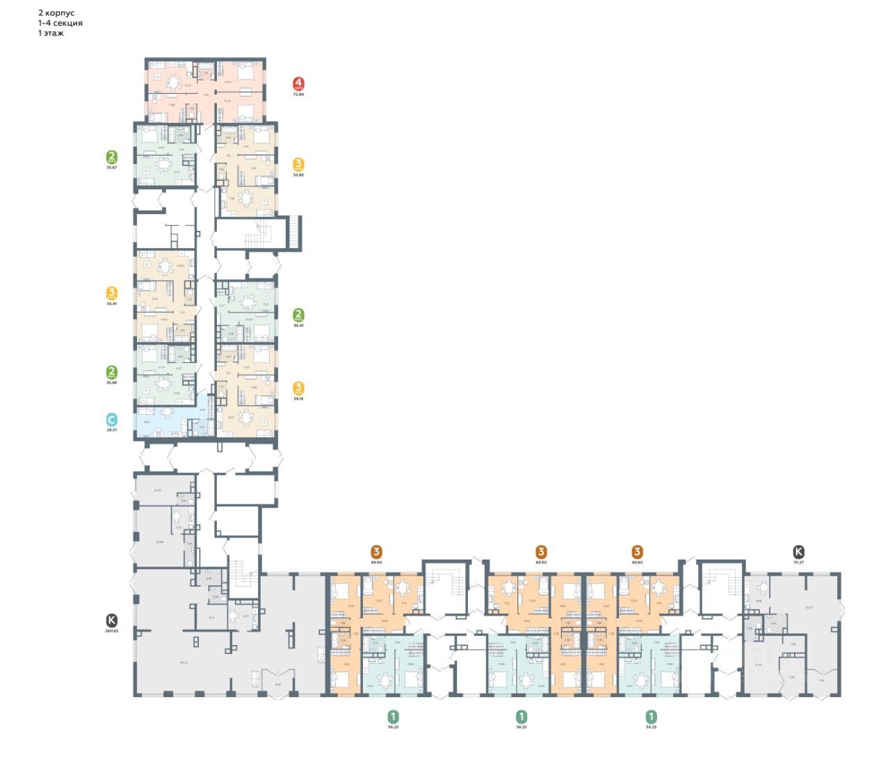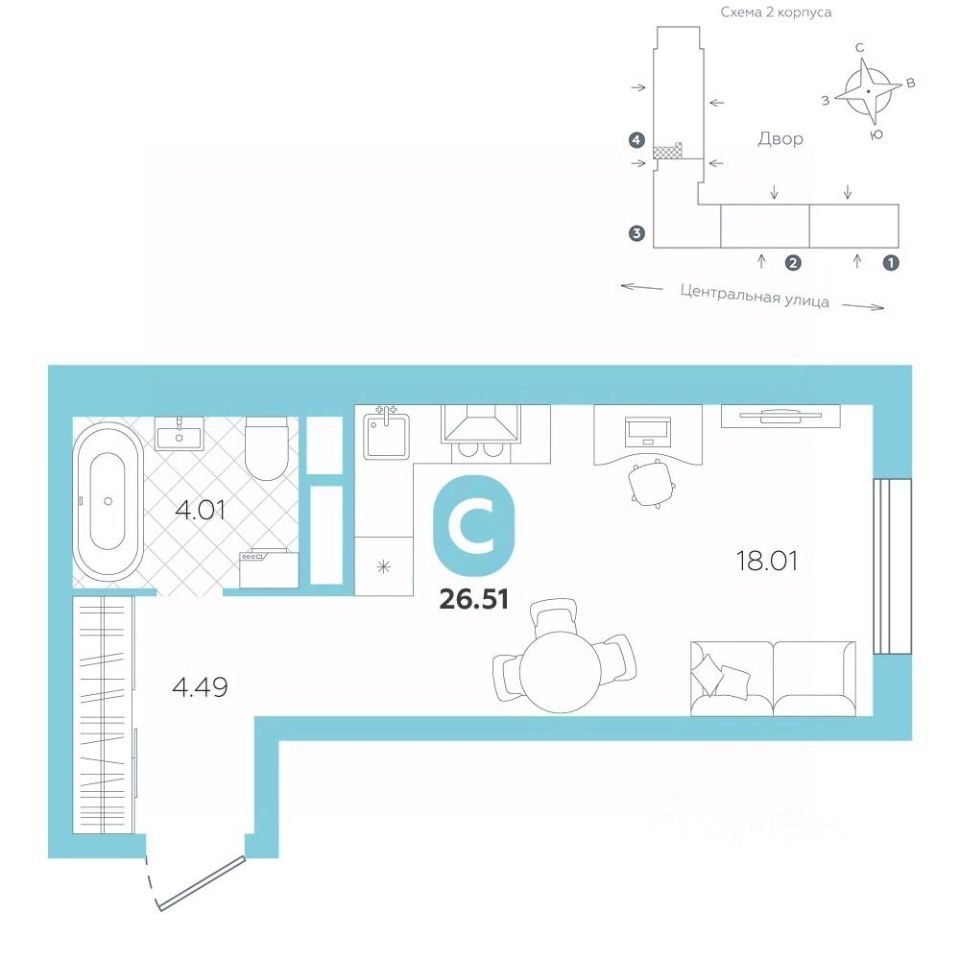 Просторная кухня-гостиная зонирована под приготовление пищи, рабочее место и зону отдых. Большая ванная комната 4,01 м². Ниша под шкафов для хранения сезонных вещей.