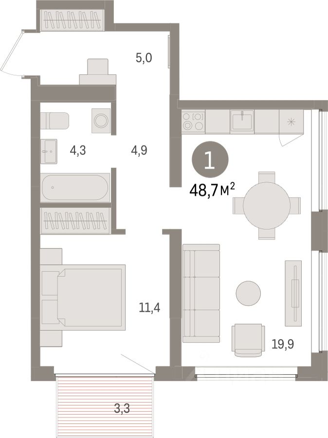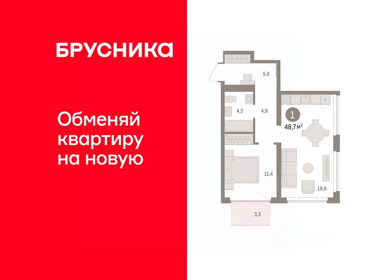 Квартира с кухней-гостиной и одной спальней в жилом районе "Речной порт". Особенности планировки: балкон, вид на реку, предчистовая отделка.