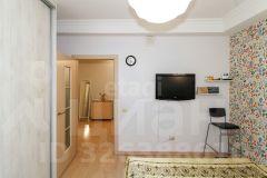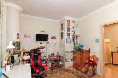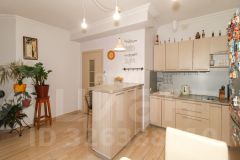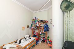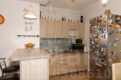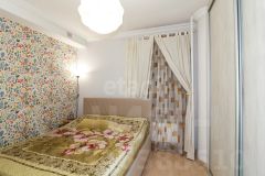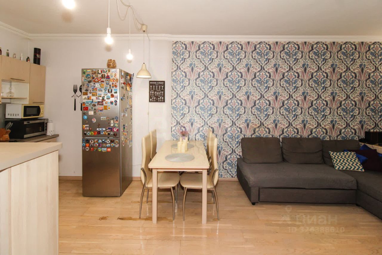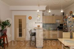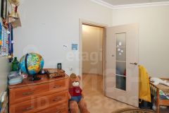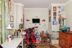 В квартире остаются все необходимые для комфортной жизни вещи: кухонный гарнитур с посудомоечной машиной, барная стойка со стульями, диван, встроенный шкаф, детская кровать, стеллаж и комод.