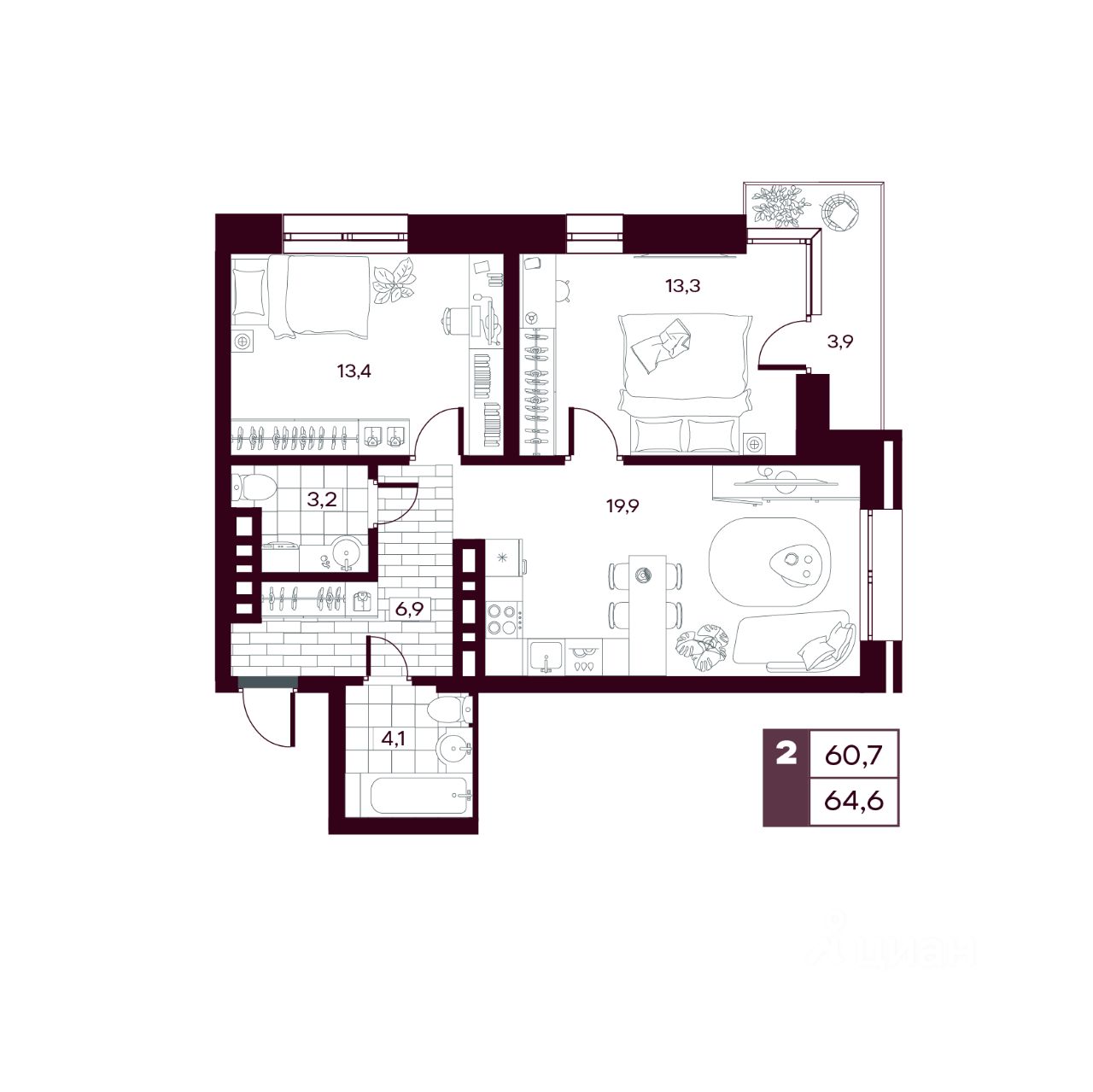 Общая площадь64,64 м²