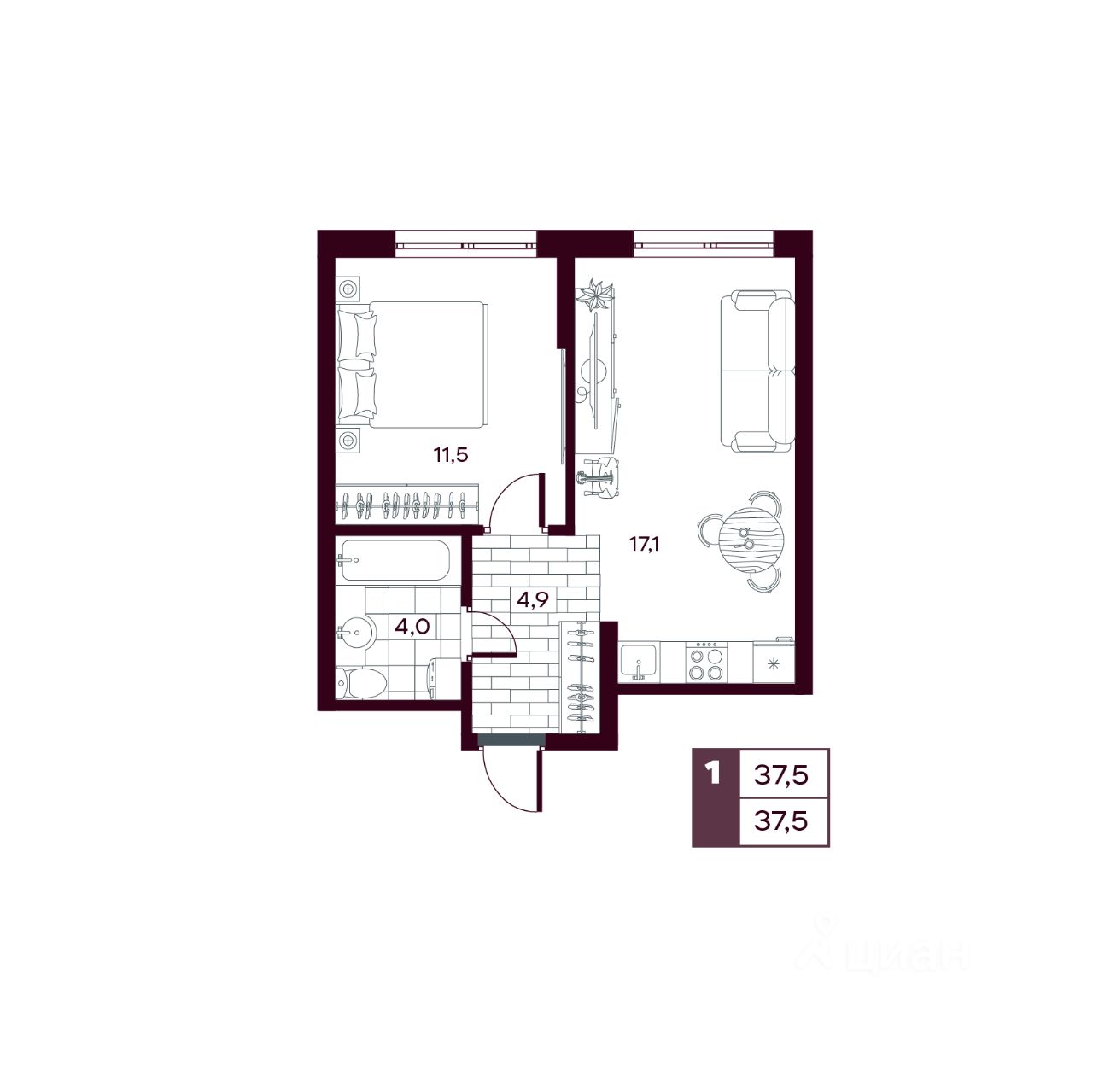 Общая площадь37,54 м²