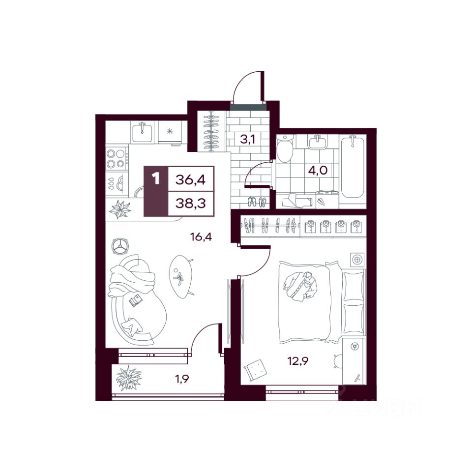 Общая площадь38,47 м²
