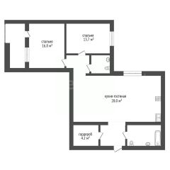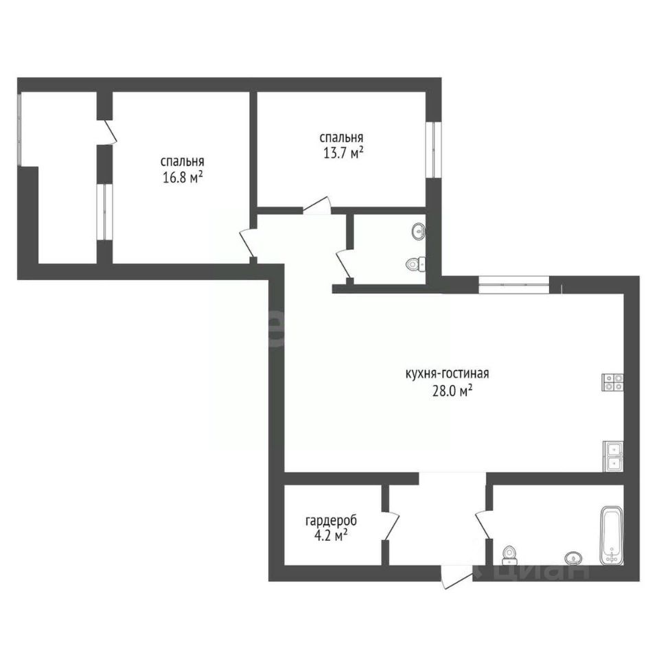 В продаже просторная квартира в современном ЖК, квартира формата 2+, с большой кухней-гостиной площадью 28 м2 и двумя большими спальнями 13,7 и 16,8 м2, функциональная планировка, есть просторная гардеробная и балкон с окнами в пол, два санузла.