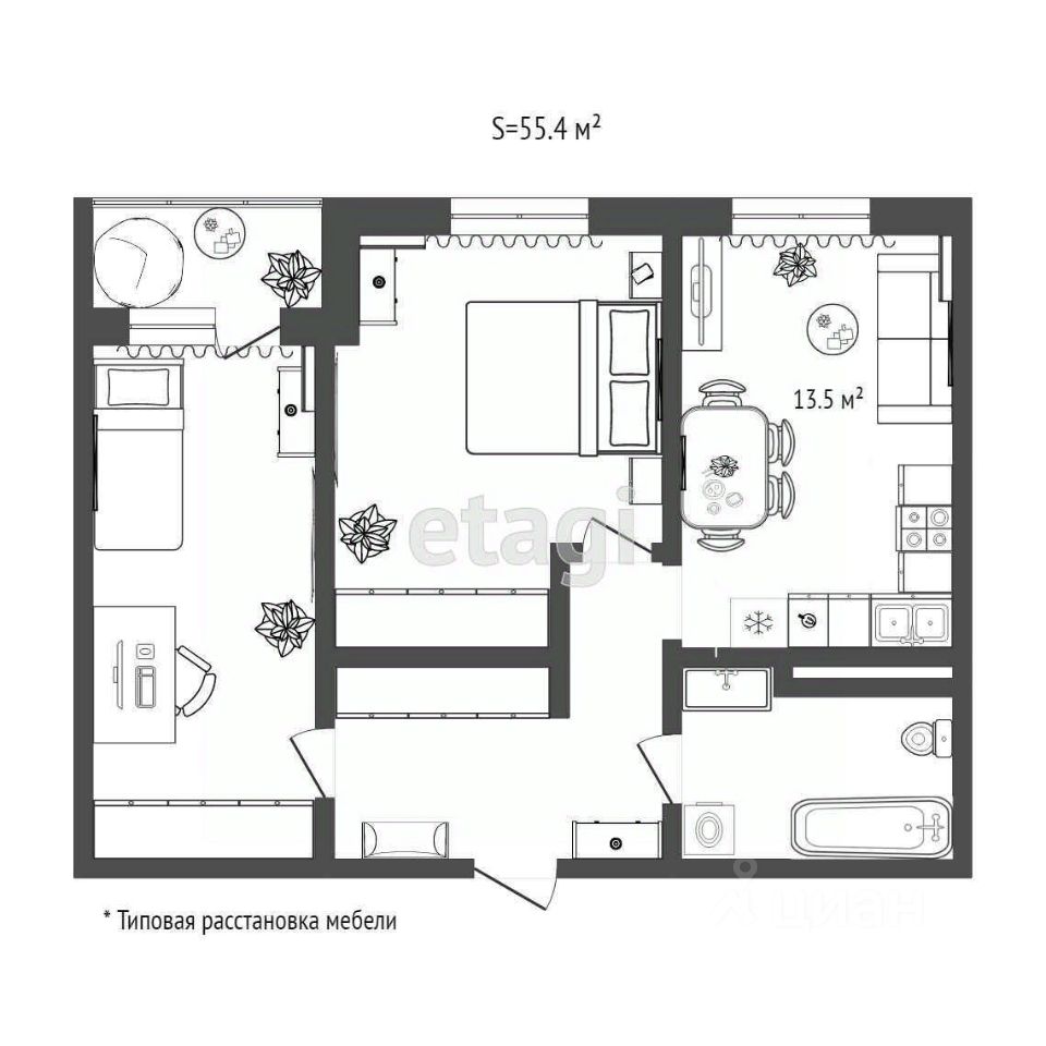 Идеальная планировка: 55.3 м², два изолированных окна в комнатах, что гарантирует уединение и комфорт для всех жильцов. Просторная кухня 10 м² — сердце будущего дома.