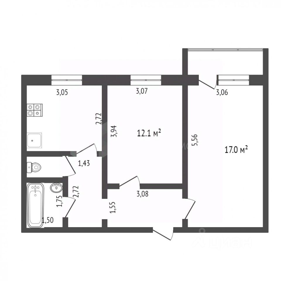 Планировка: просторная кухня, две изолированные комнаты, раздельный санузел.