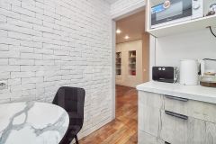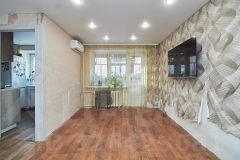 В квартире выполнен косметический ремонт. На полу постелен линолеум, на стенах обои, потолки натяжные-матовые, установлен кондиционер.