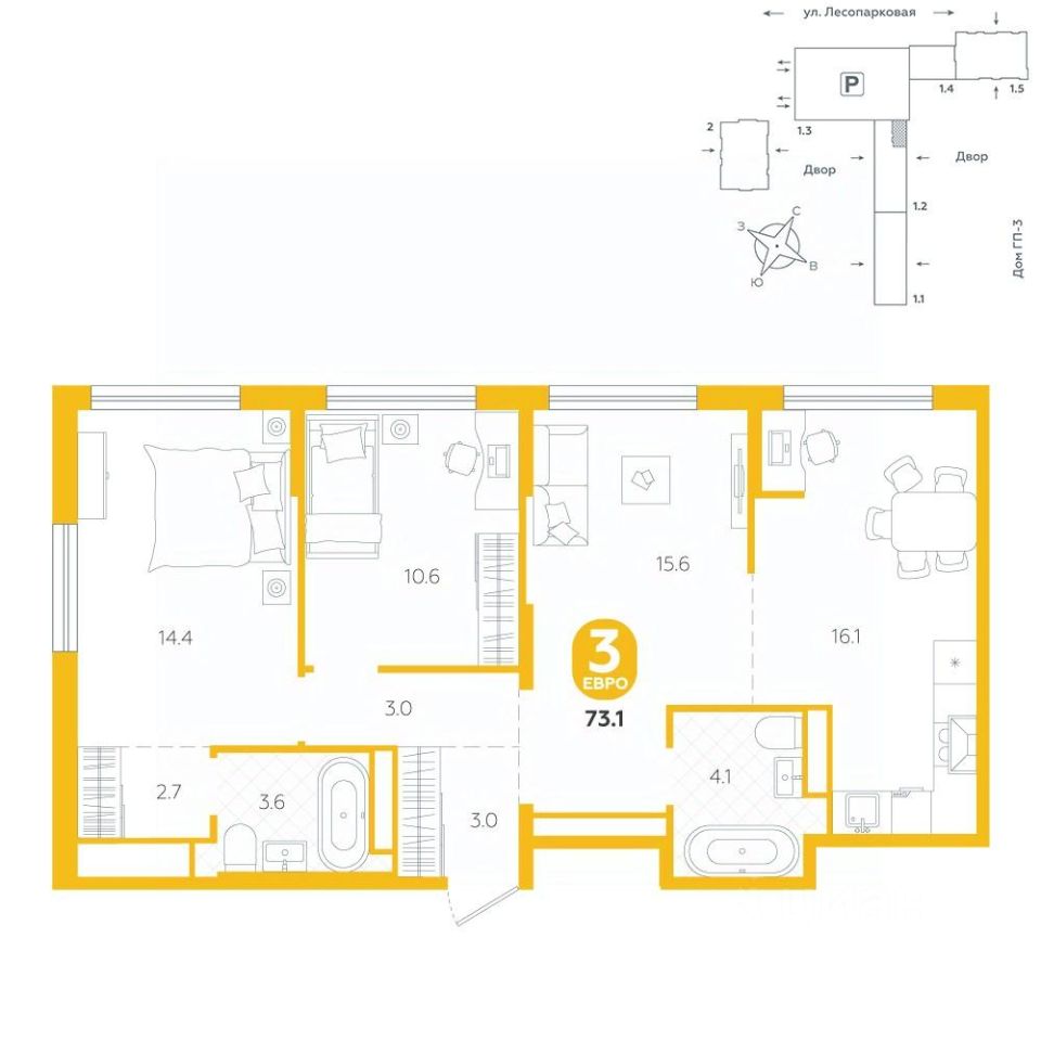 площадь квартиры - 73,1 кв.мГармоничные пропорции и большие окна наполняют пространство светом, создавая уютную атмосферу. Умное зонирование позволяет удобно организовать как рабочую, так и жилую зоны, что особенно важно для современных жителей. Санузел спроектирован с учетом всех потребностей: здесь есть ванна и место для стиральной машины. Каждый метр квартиры используется с максимальной эффективностью, что делает эту планировку отличным выбором для тех, кто ценит комфорт и удобство.