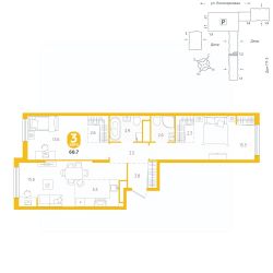 площадь квартиры - 68,7 кв.мГармоничные пропорции и большие окна наполняют пространство светом, создавая уютную атмосферу. Умное зонирование позволяет удобно организовать как рабочую, так и жилую зоны, что особенно важно для современных жителей. Санузел спроектирован с учетом всех потребностей: здесь есть ванна и место для стиральной машины. Каждый метр квартиры используется с максимальной эффективностью, что делает эту планировку отличным выбором для тех, кто ценит комфорт и удобство.