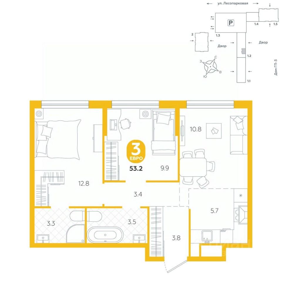 площадь квартиры - 53,2 кв.мГармоничные пропорции и большие окна наполняют пространство светом, создавая уютную атмосферу. Умное зонирование позволяет удобно организовать как рабочую, так и жилую зоны, что особенно важно для современных жителей. Санузел спроектирован с учетом всех потребностей: здесь есть ванна и место для стиральной машины. Каждый метр квартиры используется с максимальной эффективностью, что делает эту планировку отличным выбором для тех, кто ценит комфорт и удобство.