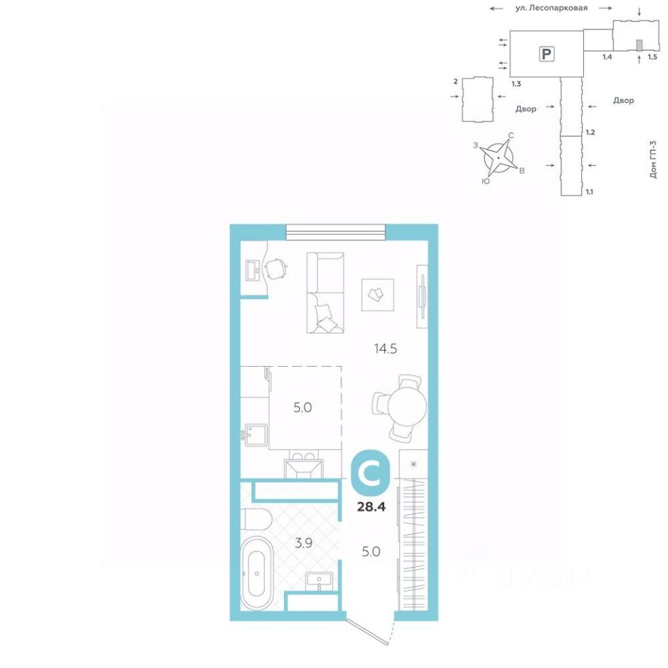 площадь квартиры - 28,4 кв.мГармоничные пропорции и большие окна наполняют пространство светом, создавая уютную атмосферу. Умное зонирование позволяет удобно организовать как рабочую, так и жилую зоны, что особенно важно для современных жителей. Санузел спроектирован с учетом всех потребностей: здесь есть ванна и место для стиральной машины. Каждый метр квартиры используется с максимальной эффективностью, что делает эту планировку отличным выбором для тех, кто ценит комфорт и удобство.