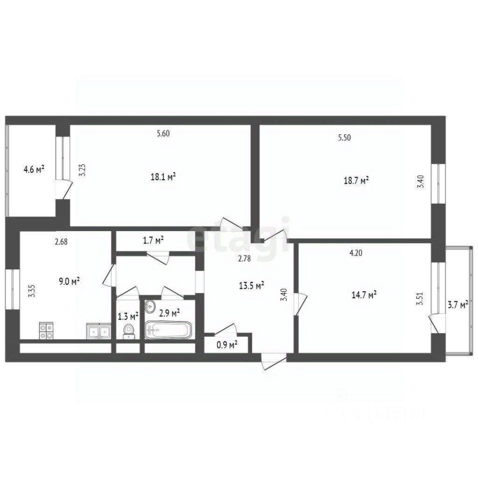 Правильной формы просторная прихожая, большие комнаты 15; 19 и 19 квадратных метров.