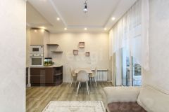 - Современная кухонный гарнитур со встроенной техникой: духовой шкаф микроволновка, варочная панель, большая вместительная посудомоечная машина.