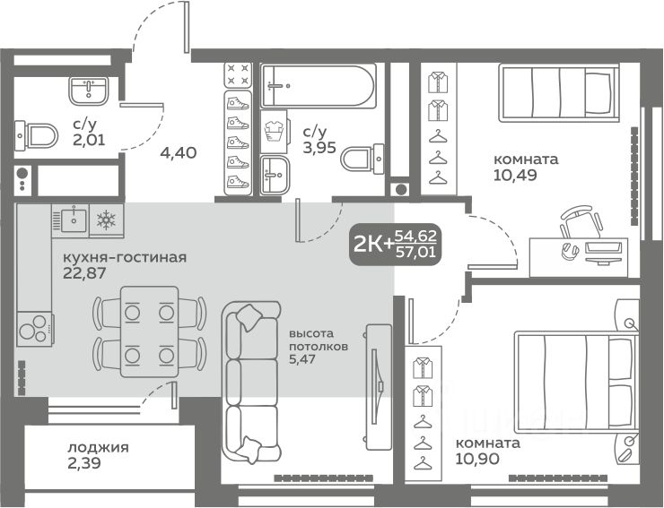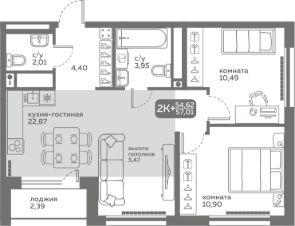 Прямая продажа от застройщика! Продается двухкомнатная квартира в строящемся ЖК "Меридиан Слобода", срок сдачи: I-кв. 2027, общей площадью 54.62 м², на 20 этаже из 20. Площадь кухни — 22.87 м².