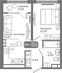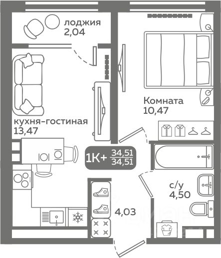 Прямая продажа от застройщика! Продается однокомнатная квартира в строящемся ЖК "Меридиан Слобода", срок сдачи: I-кв. 2027, общей площадью 34.51 м², на 4 этаже из 21. Площадь кухни — 13.47 м².