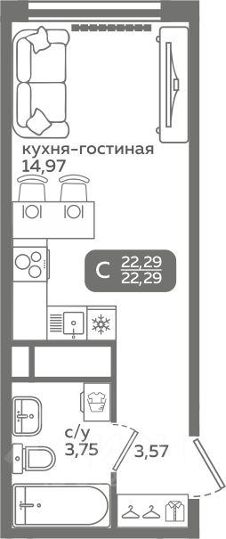 Прямая продажа от застройщика! Продается студия в строящемся ЖК "Меридиан Слобода", срок сдачи: I-кв. 2027, общей площадью 22.29 м², на 7 этаже из 21. Площадь кухни — 14.97 м².