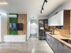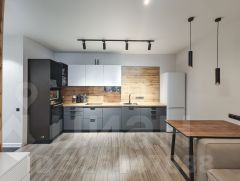 Просторная кухня-гостиная 19 кв.м., с выходом на лоджию - 4 кв.м. Современный кухонный гарнитур со встроенной техникой: варочная панель, духовой шкаф и микроволновая печь..