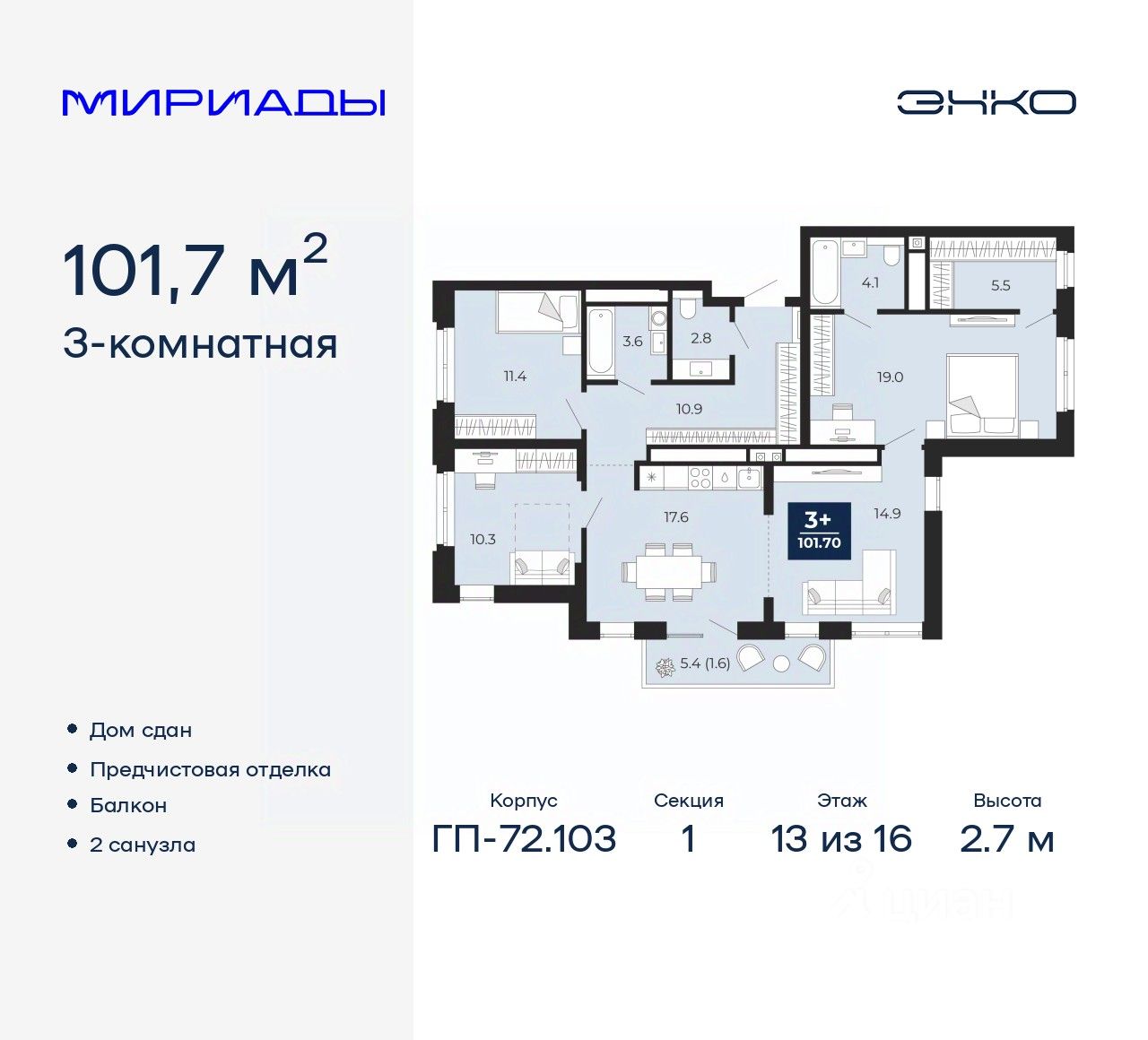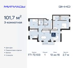 Просторная трехкомнатная квартира с предчистовой отделкой в ЖК "Мириады" на 13 этаже. Общая площадь: 101.7 кв.м., жилая: 40.7 кв.м., площадь просторной кухни-столовой: 32.5 кв.м. Квартира без проходных комнат, окна выходят нa три cтopoны дома. В квартире один балкон, два совмещенных санузла. Высота потолков 2.7 м.