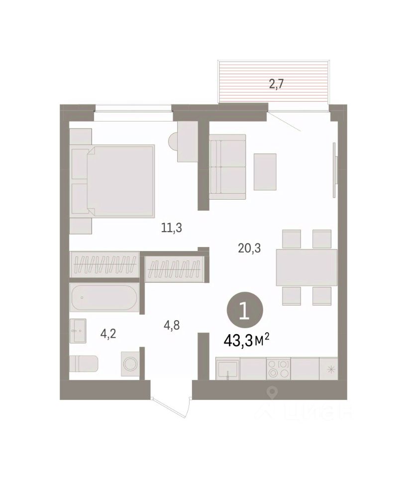 Квартира с кухней-гостиной и одной спальней в жилом районе "Речной порт". Особенности планировки: балкон, предчистовая отделка.