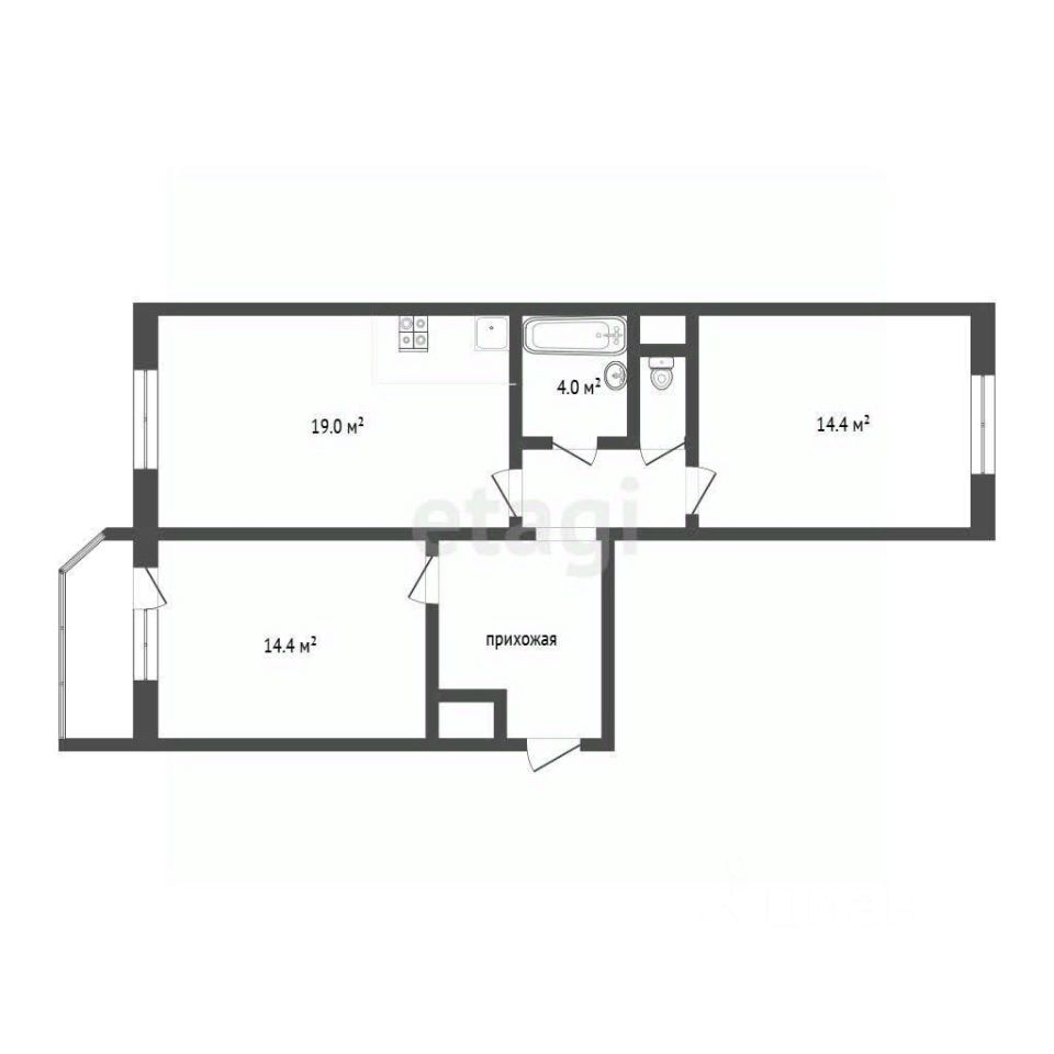 Гармоничная функциональная планировка с кухней-гостиной и двумя отдельными комнатами.