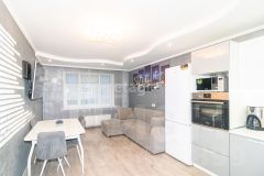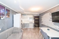 В квартире выполнен качественный ремонт: хорошая стяжка пола, электроразводка из медного кабеля, достойные двери, натяжные потолки, выровненные стены оклеены обоями, приятной расцветки, сан.узел оформлен красивой кафельной плиткой, установлены качественная сан.техника и сан.фаянс.