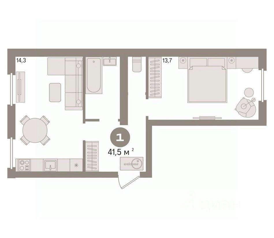 Удобная планировка: просторная кухня-гостиная, комната и раздельный санузел.