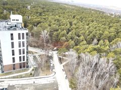 Двор хорошо благоустроен, к нему примыкают зоны отдыха со взрослыми соснами.