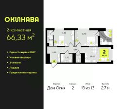 Продается 2-комн. квартира с предчистовой отделкой в ЖК "Окинава" на 13 этаже. Общая площадь: 66.33 кв.м., жилая: 24.7 кв.м., площадь просторной кухни-столовой: 14.48 кв.м. Квартира угловая, очень светлая, естественная вентиляция при открытии окон. В квартире одна лоджия, один совмещенный и один раздельный санузел. Высота потолков 2.7 м.