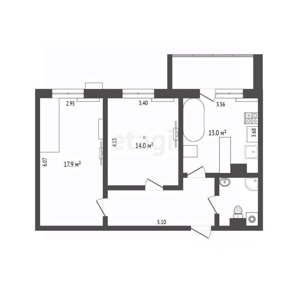 2 изолированные комнаты по 17.9 и 14 м2, уютная кухня 13 м2, остекленный балкон, совмещенный санузел,функциональная прихожая при этом не съедает полезную площадь - оборудован вместительный шкаф-купе;