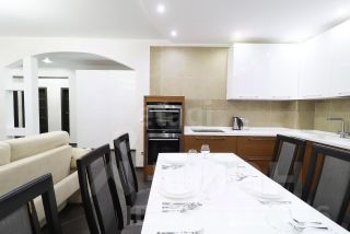 Особое внимание уделено кухне: кухонный гарнитур итальянской фирмы Aran был привезен прямо из Италии. Столешница и литая раковина изготовлены из камня, вся фурнитура — от компании Blum. На кухне установлены встроенные холодильник и морозильная камера от бренда Neff, посудомоечная машина Electrolux, а также варочная панель и духовой шкаф от Siemens.