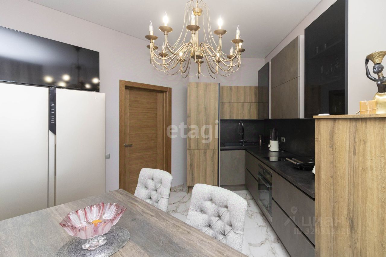 Просторная светлая кухня - сердце вашего дома. Оснащена современным кухонным гарнитуром с профессиональной фурнитурой и столешницей из искусственного камня, стильная и практичная в использовании. Встроенная бытовая техника. Фартук из широкоформатного керамогранита из Италии добавляет кухне нотку элегантности и современности.
