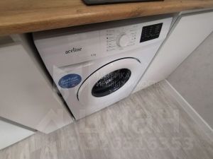 Кухонный гарнитур, варочная панель, холодильник, стиральная машина, диван, шкаф, стол, стулья.