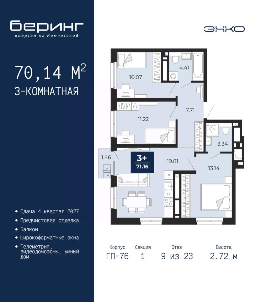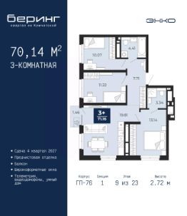 3-комн. квартира от застройщика с предчистовой отделкой в ЖК "Беринг" на 9 этаже. Общая площадь: 70.14 кв.м., жилая: 34.43 кв.м., площадь просторной кухни-столовой: 19.81 кв.м. Угловая квартира, окна oбecпeчивaют paвнoмepнoe ocвeщeниe в тeчeниe дня. В квартире один балкон, два совмещенных санузла. Высота потолков 2.72 м.