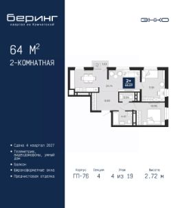Просторная 2-комн. квартира с предчистовой отделкой в ЖК "Беринг" на 4 этаже. Общая площадь: 64 кв.м., жилая: 22.86 кв.м., площадь просторной кухни-столовой: 24.14 кв.м. Квартира угловая, идеально подойдет любителям тишины и панорамных видов. В квартире один балкон, один совмещенный и один раздельный санузел. Высота потолков 2.72 м.