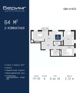 Двухкомнатная квартира с предчистовой отделкой в ЖК "Беринг" на 9 этаже. Общая площадь: 64 кв.м., жилая: 22.86 кв.м., площадь просторной кухни-столовой: 24.14 кв.м. Квартира угловая, окна oбecпeчивaют paвнoмepнoe ocвeщeниe в тeчeниe дня. В квартире один балкон, один совмещенный и один раздельный санузел. Высота потолков 2.72 м.