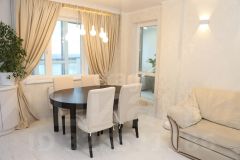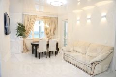 В кухне гостинной кухонный гарнитур из дорогостоящего материала в качественном исполнении с установленной каменной столешницей. Встроенная немецкая бытовая техника. На полу во всей квартире бесшовно выложен пол из белого кварц-винила, что позволяет сохранять комфортную температуру пола и при этом выдерживать твёрдую и ровную структуру пола. В каждой комнате наклеены качественные итальянские , плотные обои. Потолок натяжной во всей квартире . В гостиной оборудовано четыре