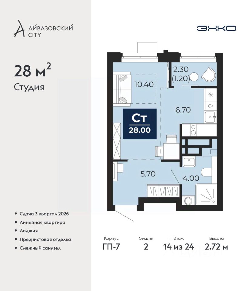 Просторная однокомнатная квартира-студия с предчистовой отделкой в ЖК "Айвазовский City" на 14 этаже. Общая площадь: 28 кв.м., площадь гостиной 17.1 кв.м., из которых 6.7 кв.м. выделено под кухонную зону. Все окна выходят на одну сторону. В квартире одна лоджия, один совмещенный санузел. Высота потолков 2.72 м.
