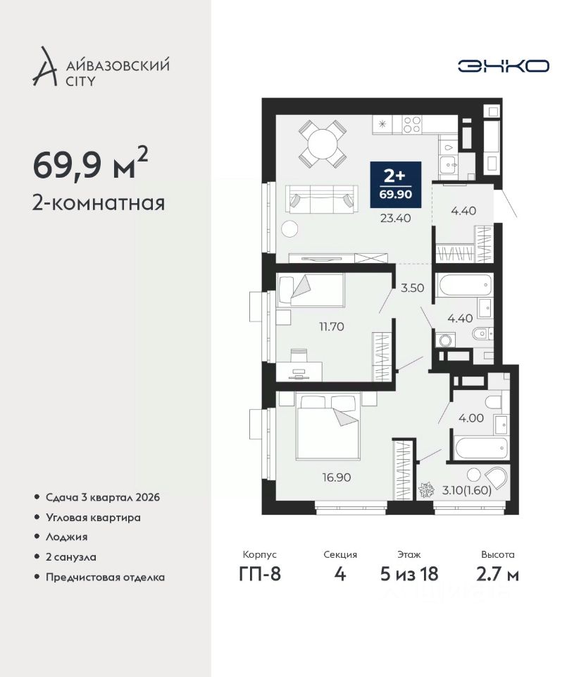 Двухкомнатная квартира от застройщика с предчистовой отделкой в ЖК "Айвазовский City" на 5 этаже. Общая площадь: 69.9 кв.м., жилая: 28.6 кв.м., площадь просторной кухни-столовой: 23.4 кв.м. Квартира угловая, окна oбecпeчивaют paвнoмepнoe ocвeщeниe в тeчeниe дня. В квартире одна лоджия, два совмещенных санузла. Высота потолков 2.7 м.