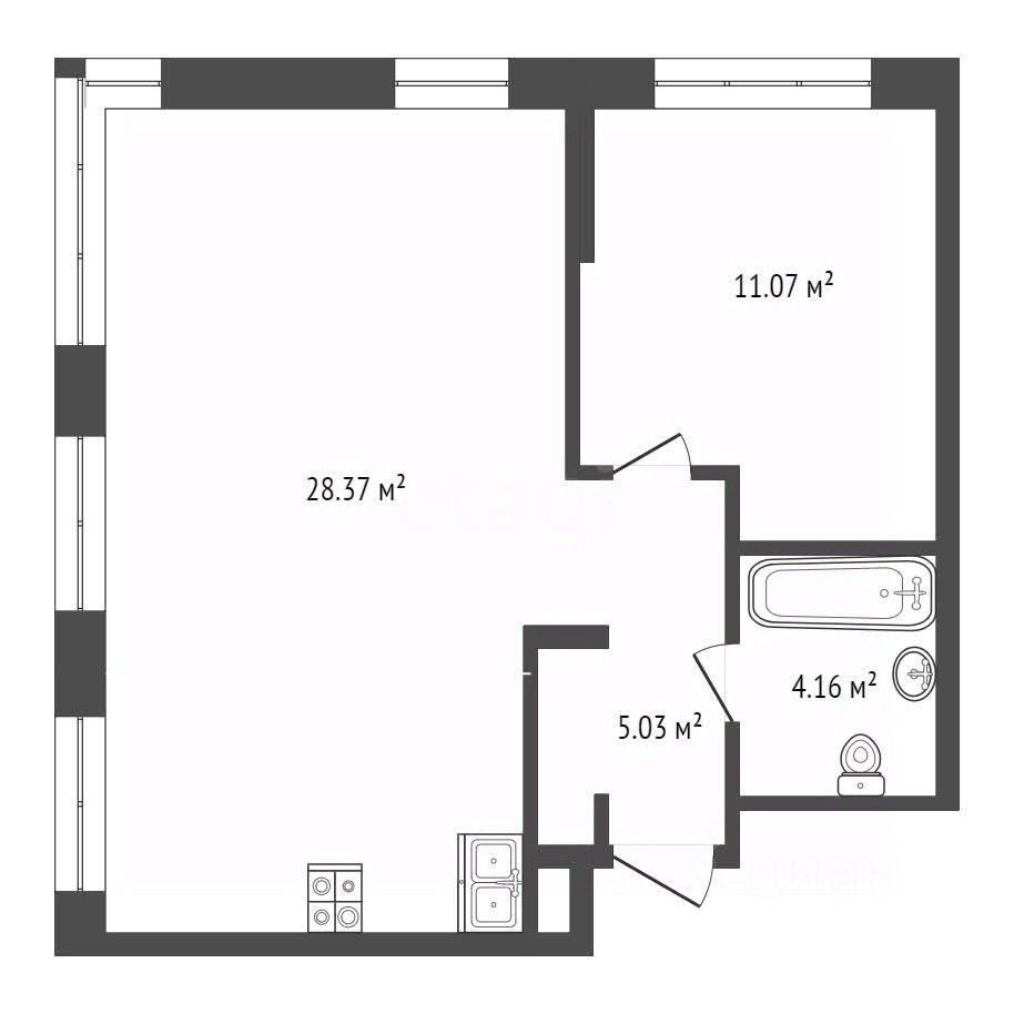 • Планировка: кухня-гостиная, комната и совмещенный санузел.