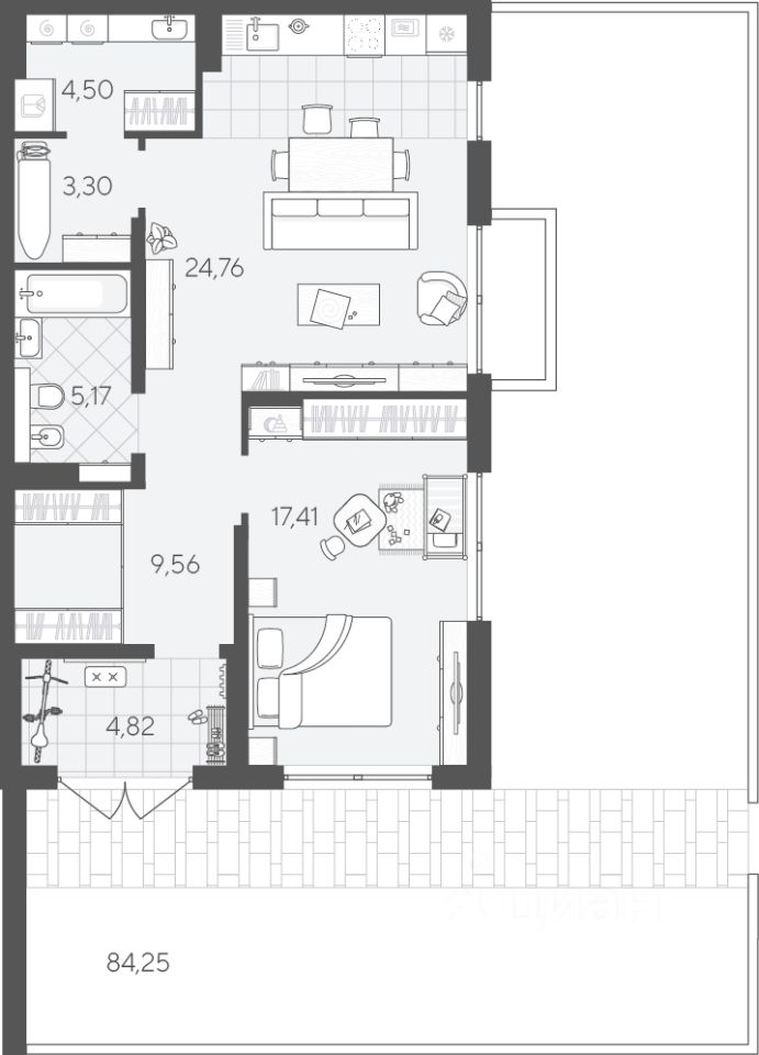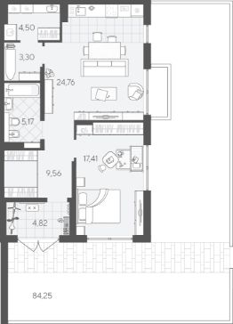 Уютная однокомнатная квартира 69.52 кв.м на 1 этаже. Функциональная планировка позволяет удобно организовать быт, а кухня-гостиная подойдёт для отдыха и общения.