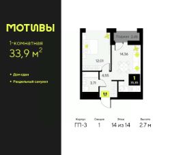 1-комн. квартира в ЖК "Мотивы" на 14 этаже. Общая площадь: 33.9 кв.м. Высота потолков 2.7 м.