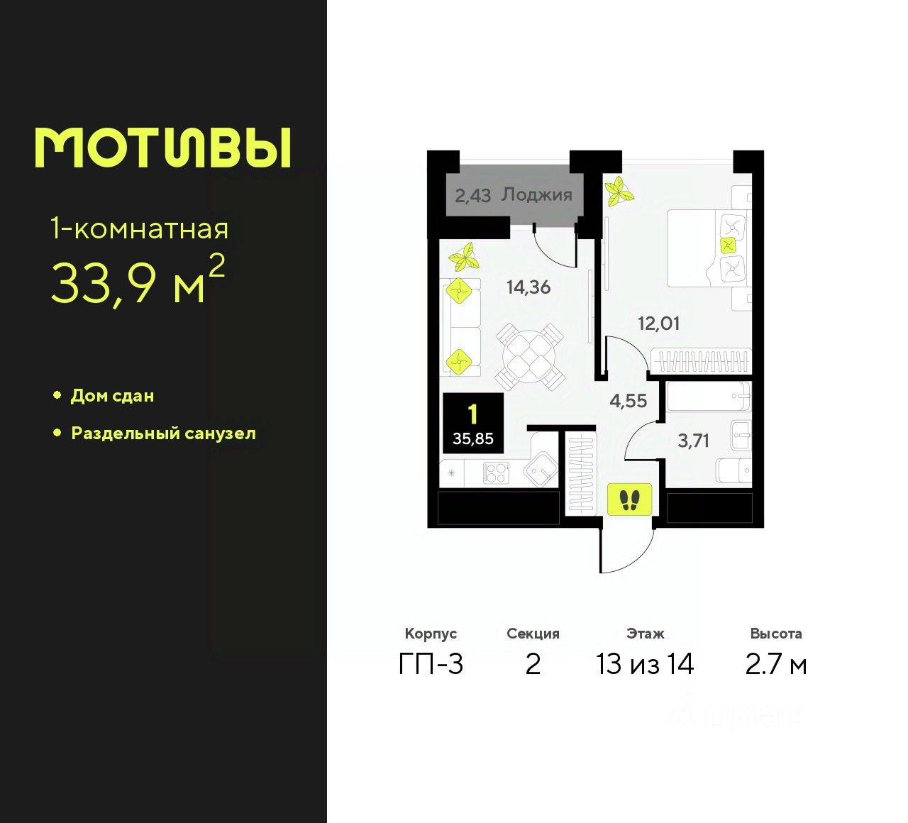 1-комн. квартира в ЖК "Мотивы" на 13 этаже. Общая площадь: 33.9 кв.м. Высота потолков 2.7 м.