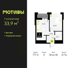 Просторная 1-комн. квартира в ЖК "Мотивы" на 14 этаже. Общая площадь: 33.9 кв.м. Высота потолков 2.7 м.