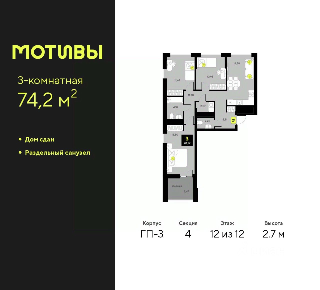 Продается 3-комн. квартира в ЖК "Мотивы" на 12 этаже. Общая площадь: 74.2 кв.м. Высота потолков 2.7 м.