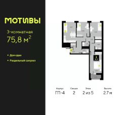 3-комн. квартира в ЖК "Мотивы" на 2 этаже. Общая площадь: 75.8 кв.м. Высота потолков 2.7 м.