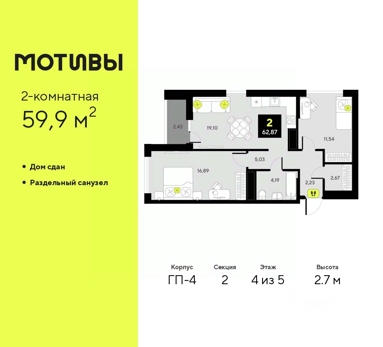 Продается 2-комн. квартира от застройщика в ЖК "Мотивы" на 4 этаже. Общая площадь: 59.9 кв.м. Высота потолков 2.7 м.