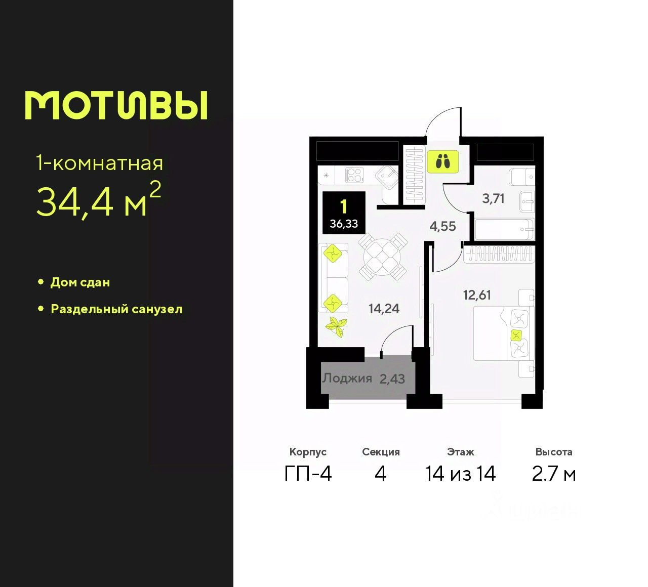 Просторная однокомнатная квартира с предчистовой отделкой в ЖК "Мотивы" на 14 этаже. Общая площадь: 34.4 кв.м., жилая: 12.61 кв.м., площадь просторной кухни-столовой: 14.24 кв.м. Все окна выходят на одну сторону. В квартире одна лоджия, один совмещенный санузел. Высота потолков 2.7 м.