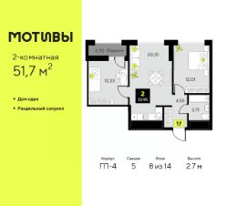 Двухкомнатная квартира от застройщика в ЖК "Мотивы" на 8 этаже. Общая площадь: 51.7 кв.м. Высота потолков 2.7 м.